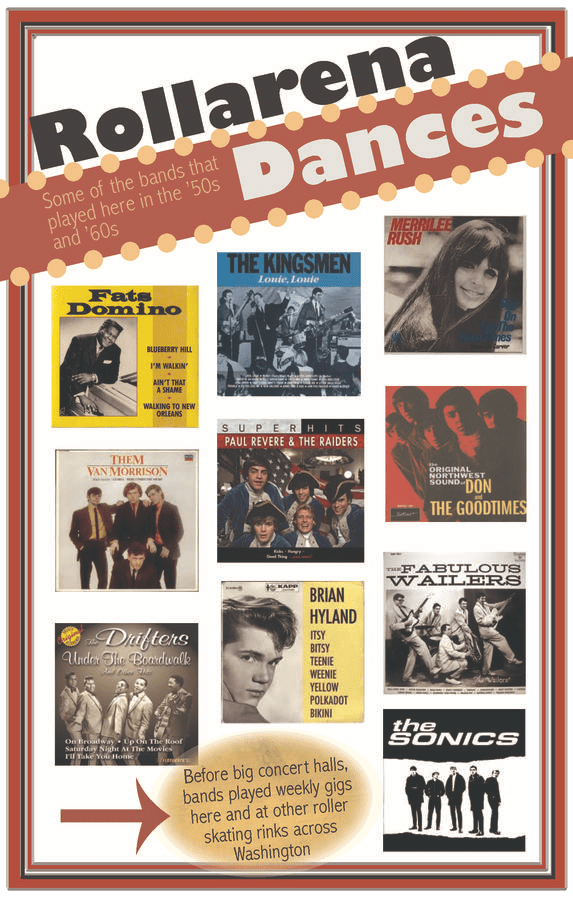 Roller Skating since 1953 has seen many eras. In the ‘50s, most skaters in evening sessions were young adults. Many future spouses met here. The music, like all rinks at the time, was organ music of waltzes, tangos, and foxtrots. In a time when there were few opportunities for girls to play sports, roller skating filled a void. In the late ’50s and 60s, Rollarena along with a few other Washington State rinks was on perhaps the best dance circuit in the country. Every Saturday night national acts such as Fats Domino, The Drifters, or the Animals played along with Northwest groups like Paul Revere and the Raiders, The Kingsman, The Wailers, and The Sonics. The late ‘70s and early ‘80s was the Disco era. Organ music was gone and Saturday Night Fever was on. Roller skating was hip for Hollywood stars. This era saw the biggest crowds skating since the sport was invented. Many innovations at this time made skating a much more enjoyable experience like the urethane wheel and floor coatings that ended the need for dusty powder to maintain traction. With the powder gone, the lobby could be carpeted, and a high-end sound system could be installed. In the ‘90s came inline skates. Today birthday parties have become increasingly popular.